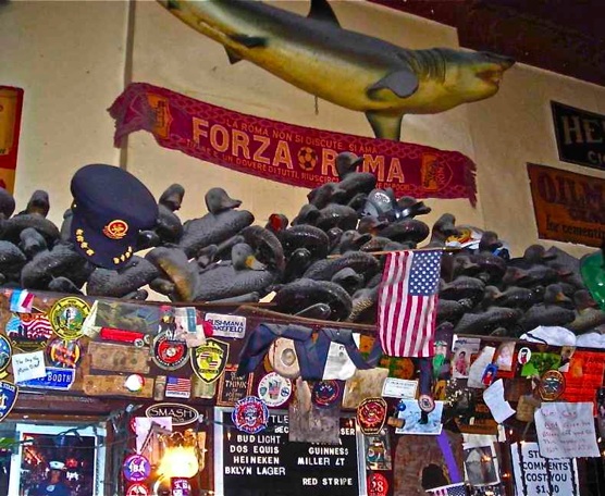 Things had changed for me as well since leaving Fredonia. I was painting now, and the duck sculptures were taking up valuable studio space. The ducks weren’t going to be exhibited again, but I got an idea about how they could make a final appearance. With a truck full of ducks and a camera in hand I headed south toward the Hudson River. The plan was to release the ducks on the evening tide, taking pictures of the avian flotilla as it drifted out into New York harbor, slowly becoming Staten Island’s problem. But there was a hitch in the timing --- sunset was still a couple of hours away. Since I was in the neighborhood I stopped at the Raccoon Lodge. Over a beer I told Gary Morano about my plan. He listened with interest, then went outside to look in the truck. A few minutes later he came back inside. “Can I have the ducks?” he said, “They might look good over the bar.”