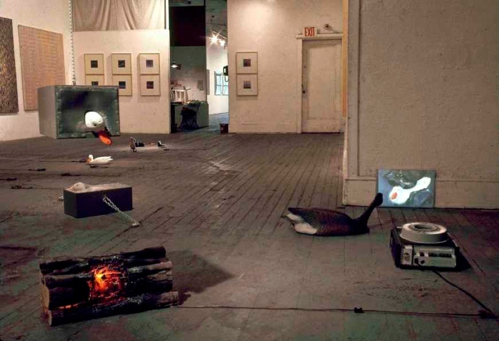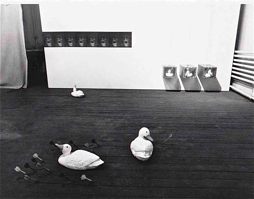 In 1974 I was one of six outside artists chosen to show at the 55 Mercer Street Gallery. It came as a surprise because at the time I was working with non-art materials such as decoy ducks, animal traps, an electric fire, wire mesh, chains, pulleys, xeroxed faces and chocolate chip cookies in formal sculptural relationships, not the type of art you’d associate with New York. In retrospect the selection made sense because many of the artists who juried the work were involved with non-art materials themselves. The concept of non-art (and by inference non-serious) materials may seem odd by postmodern standards, but in 1971, when I’d returned from military service to complete a master’s degree at Syracuse University, two well-known visiting artists both declined to critique my work on the grounds that it wasn’t serious art. The imagery was a repetition of cartoon-like skies, clouds and aircraft spray-painted on illustration board. Having minor second thoughts one told me later, ”I thought to myself, the work is a joke but the guy keeps making the stuff.” That is a good example of the critical water artists swam in in those days, particularly artists using string, sisal, or water as material.