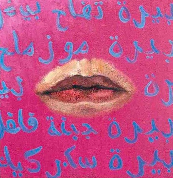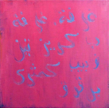 The Egyptian hieroglyphics, English text and Arabic script in these paintings repeat common needs found in every guidebook for travelers --- food, shelter and communication. Each painting is a foreigner’s attempt at conversation.