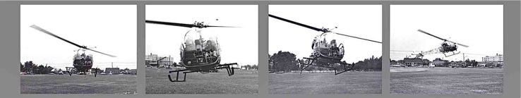 HOVER PIECE was a second public artwork performed in 1973. In this piece a Bell G4A helicopter was used as kinetic sculpture by performing purely visual maneuvers in public areas of Buffalo and Niagara Falls, New York. Arriving unannounced in public parks, the aircraft flew maneuvers such as rocking in arc-shaped patterns, flying sideways or backward, and hovering at zero airspeed a few feet above open land or open water.